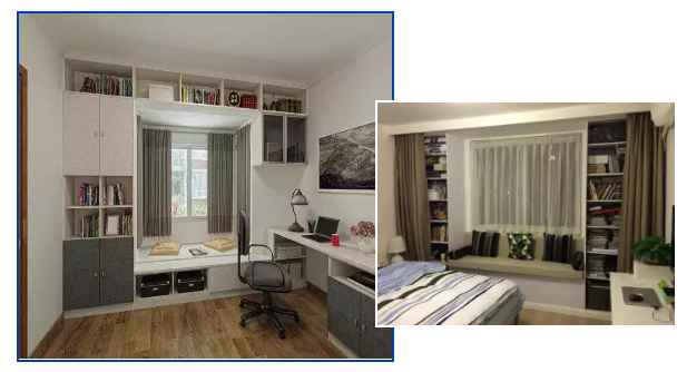 如果房间空间比较小,不妨可以利用飘窗的这个位置,来增加一个书桌的位置,当你长时间对着电脑工作,眼睛疲惫时,只要抬头,就能看见外头的青草绿树。