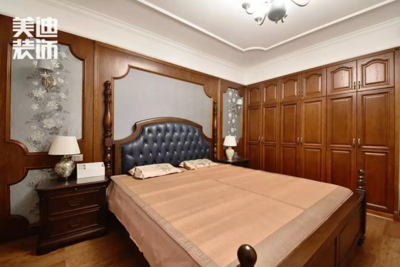 主卧没有过多繁复的装饰,实木地板、美式乡村风复古台灯、典雅的壁纸等都给空间增添了古典优雅的韵味,营造温馨自然的睡眠环境。