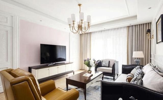室内电视墙刷成了粉色,与白色的石膏线和屋顶搭配,显得清新雅致。客厅沙发采用了组合摆放方式,容客率很赞,又提升了整体的调性!