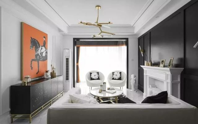 白色的壁炉造型做在黑色的背景墙,带斑点的黑色电视柜上有着精致的金属作为点缀,舍弃了电视机,用橙色的挂画来装点客厅,更加有文化气息。