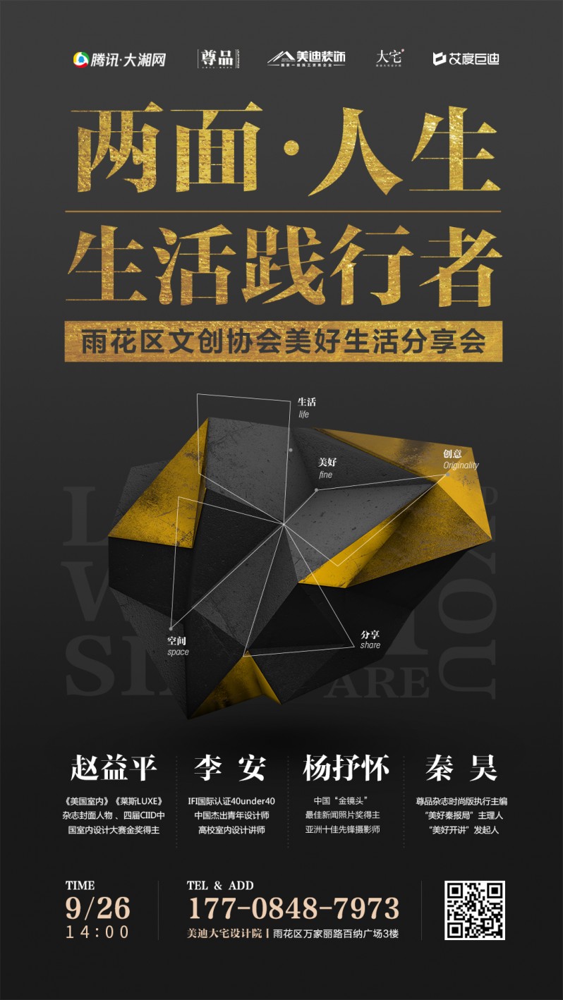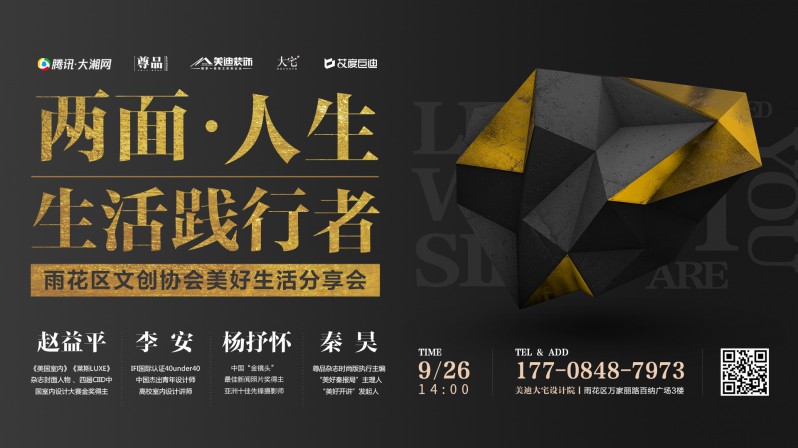 9月26日美迪装饰&雨花区文创协会“两面人生·生活践行者”分享会活动与大家见面。这次分享会活动将特别邀请到《美国室内》《莱斯LUXE》杂志封面人物/中国最具权威室内设计大赛金奖得主赵益平老师、IFI国际认证40under40中国杰出青年设计师/HIID湖南省建筑室内设计学会常务理事李安老师,以及亚洲十佳先锋摄影师杨抒怀老师作为主讲嘉宾出席。三位老师将从不同的角度,探索美好生活的真正模样,以开拓视野和思维激荡启发您对美好生活的另一种思考,期待您的参加!