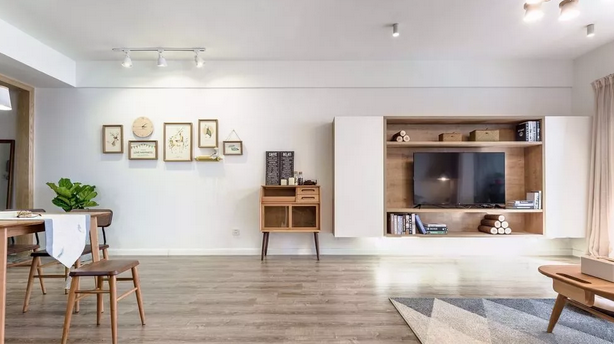 麋鹿挂画使原本单调的白墙显得几分可爱复古;简单利索电视组合柜,符合大家喜欢囤货的小习惯,既满足储物的同时,也完全与温馨的空间相融合。