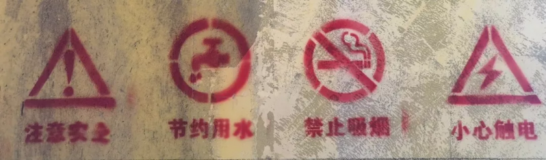 小美一进入工地现场,就看到这醒目的警示图标,时刻提醒着工人安全第一,当然节约资源也不能忘记。