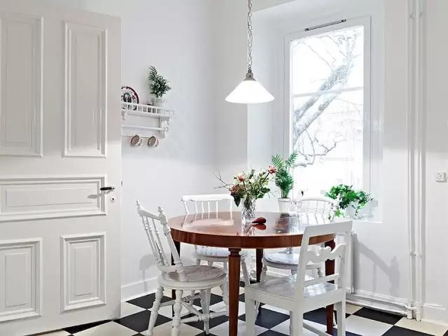 厨房的白色大门简洁明亮,推门而入踩着黑白格子的地板,白色椅子围绕深色实木圆桌,避开完全的纯白,体现强烈的对比度。