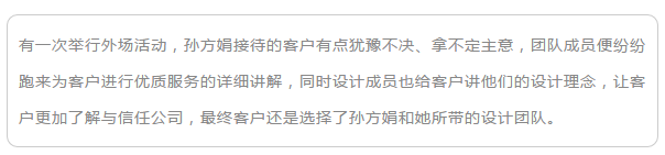 人们常说:“人心齐,泰山移”,团队合作在日常工作中起着至关重要的作用。孙方娟把团队成员各方面的优势凝聚在一起,使得团队成员很好地相处与沟通,彼此都拥有着团队荣誉感和使命感,所以团队就能将业绩提升起来。