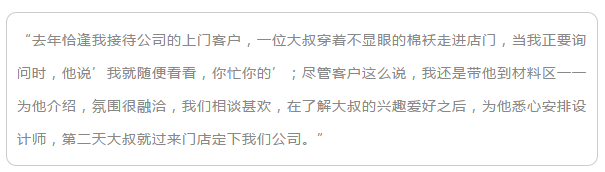 大叔选择美迪时,说:“在来你们公司之前,我跑了长沙很多装修公司,我只要一说是随便看看的,他们就不搭理我,我也就出来了;但你们公司的接待不同,非常热情地为我介绍,尽管我那样说,你还是为我详细地介绍,而且我对你安排的设计师很满意”。