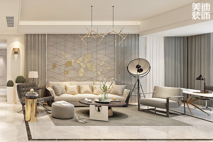 通过纯净简洁的空间规划与材质的运用,在舒适和美观,在实用和梦想之间取得平衡。大面积的黑白灰与金属质感以及菱角分明的家具相结合,完美的展现业主所期盼的家居环境。