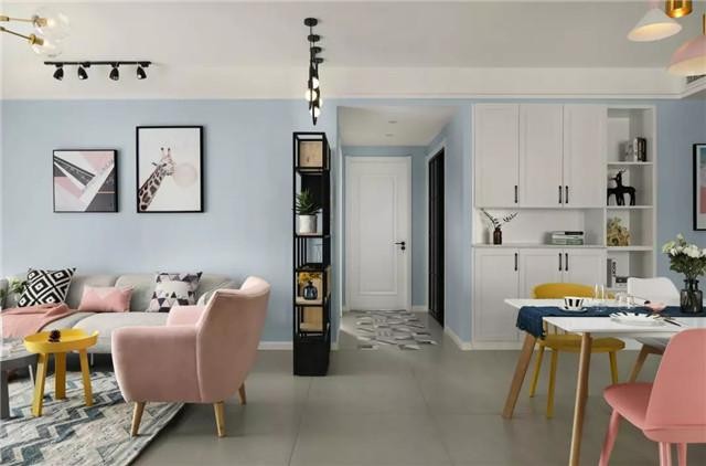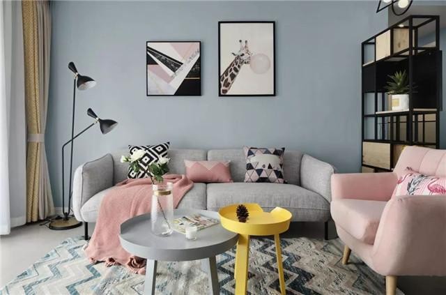 客厅是浅蓝色的背景,装饰画一大一小,几何图案和长颈鹿的邂逅妙趣横生,全局灰蓝色作为打底,衬托出淡山茱萸粉的甜美,加上黄色的点缀,多了一份清新的气息。