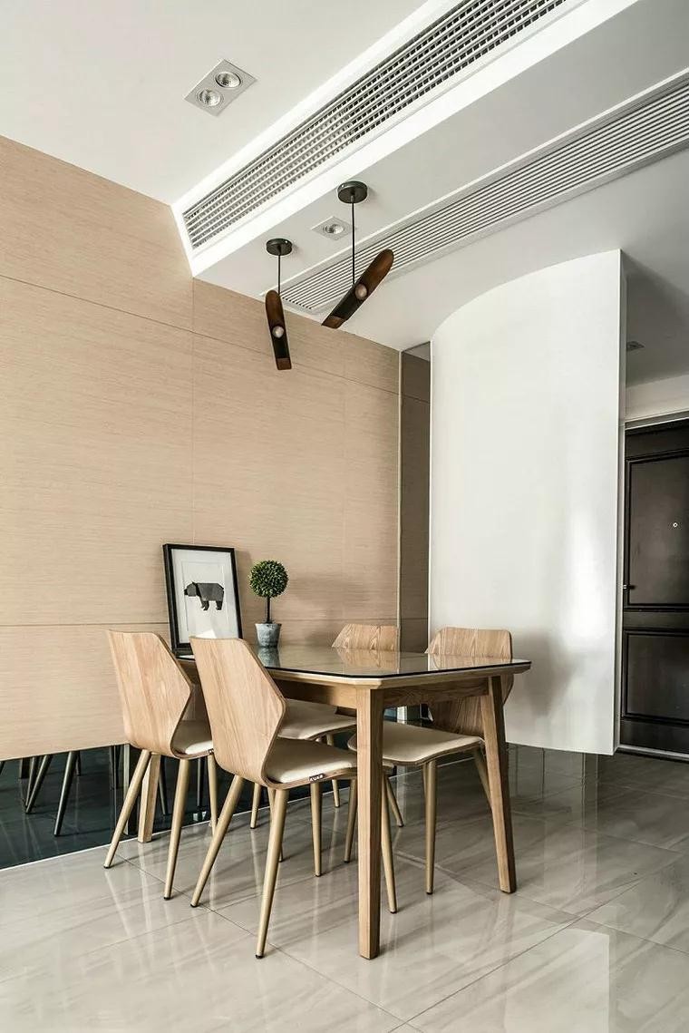 在这个弧形收纳柜的背后,就是餐厅区域。墙面木质感的处理,茶镜处理的墙脚,搭配上木质感的餐桌椅,充满自然简约的空间气息。