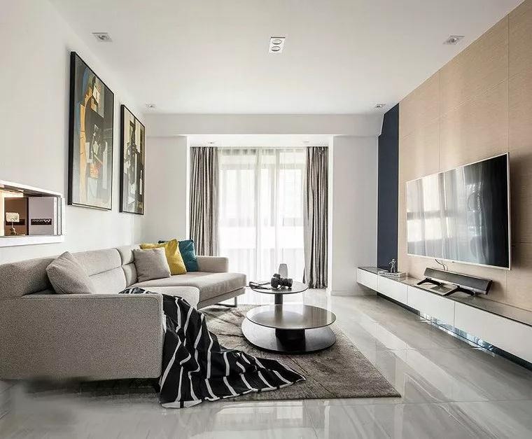 客厅空间简洁现代为主,电视墙木纹的基础在侧边加入黑色的墙,让空间层次感更加丰满。舒适自然的布艺沙发,沙发墙上还装了个书架搁板,搭配2幅大装饰画,呈现出一个年轻自然的空间感。