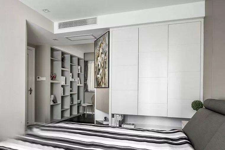 卧室空间以气质简单为主,同时主卧还打通了书房,把他们并入到一个相对比较宽松的空间内。床旁边的衣柜底部留空作为置物层,整体显得格外的实用自然。