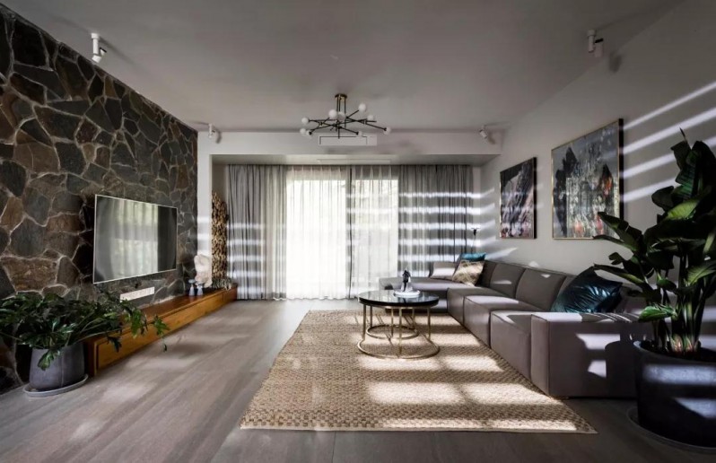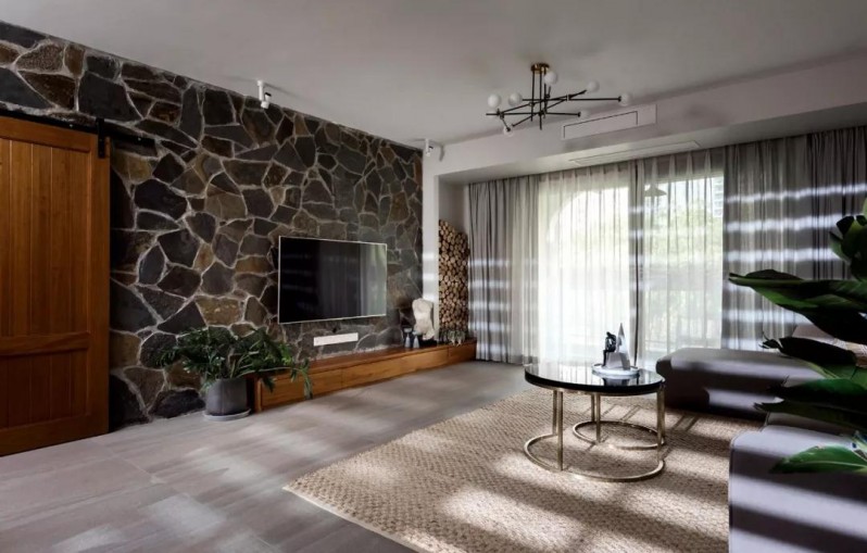 天然乱石打造的电视墙,壁边的原木堆砌,表达了业主对自然的由衷热爱。