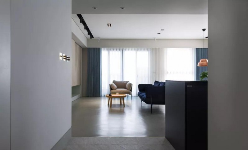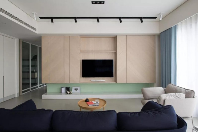 客厅水泥色地面简单地摆上家具,浅绿和深蓝的色彩搭配,给人一种自然的感觉。原木柜的电视墙,可以通过移门的推拉方式对电视进行隐藏。