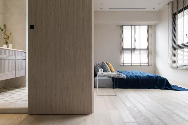 主卧的布局也很简单直接,通过墙体划分出了衣帽间、主卫和休息的区域,没有过多的布置,显得特别的轻松舒适。