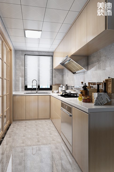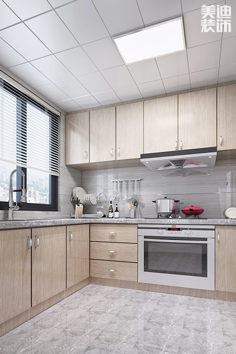 这款l型厨房装修虽然简约,但非常时尚,浅木色的橱柜使得整个厨房充满了青春气息,橱柜的布局设计非常适合大众家庭,功能布局完全按照人体工学操作原理进行排列组合。