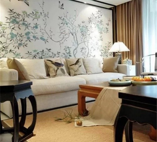 这款现代中式装修中,壁纸虽有中国风情,但给人的感觉就是现代感很强。沙发并不是我们想象中的传统样式沙发,但舒适度很好,因为一般的年轻人都坐不惯那种硬木头的沙发。