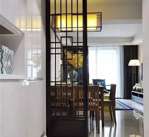 玄关采用了中式镂空隔断来打造,以免影响了风水。体现清晰的中式立意,表达美学中影影绰绰的意境。底部全木板的设计,可加固花格的强度,防小孩踢,防玩具车撞击,也挡住冬天里穿堂的脚底凉风。