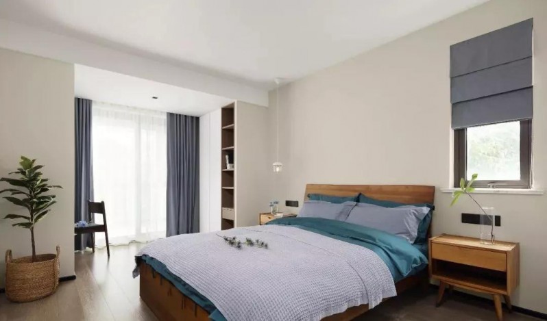 主卧墙面运用米色平衡空间重心,而自然的原木气息暗示着属于这个年龄层次的沉稳内涵,搭配蓝色系的布艺品,呈现出静谧柔和的质感。