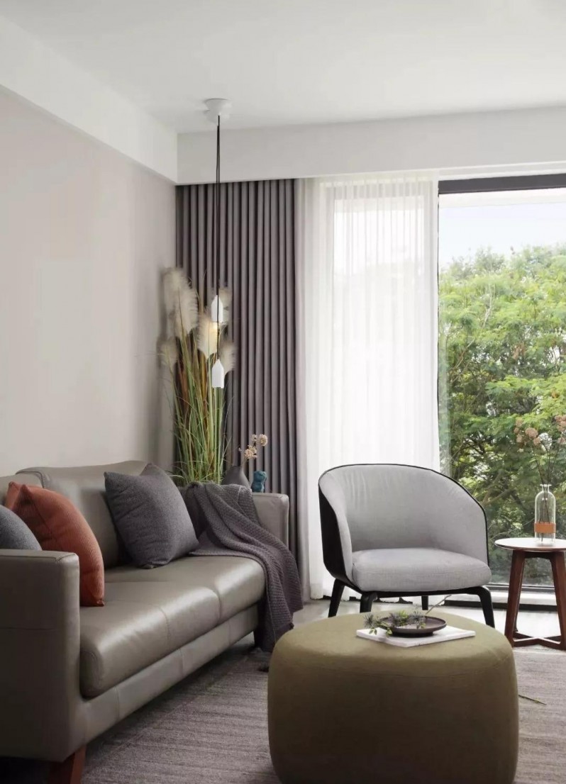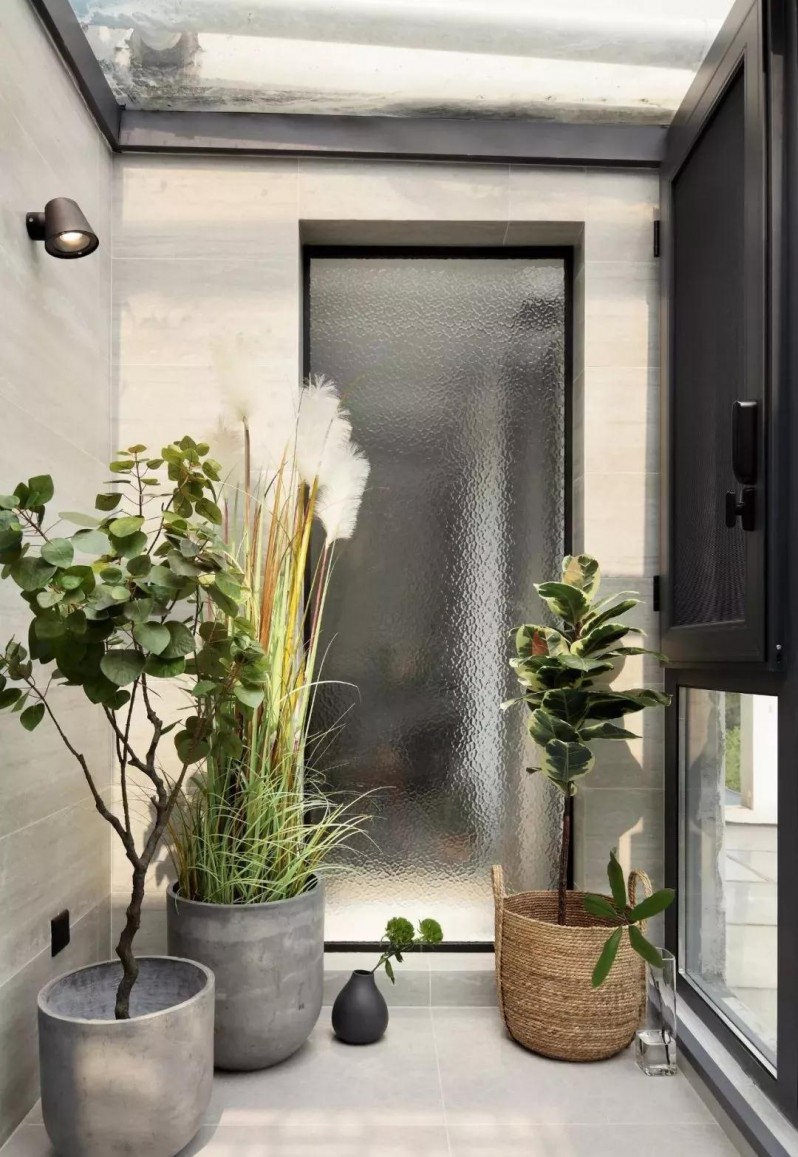 改造成阳光房的阳台,与客厅只用玻璃相隔,一内一外之景。因为水波纹立体凹凸的质感和光影的透射,视觉感受显得清雅宜人。