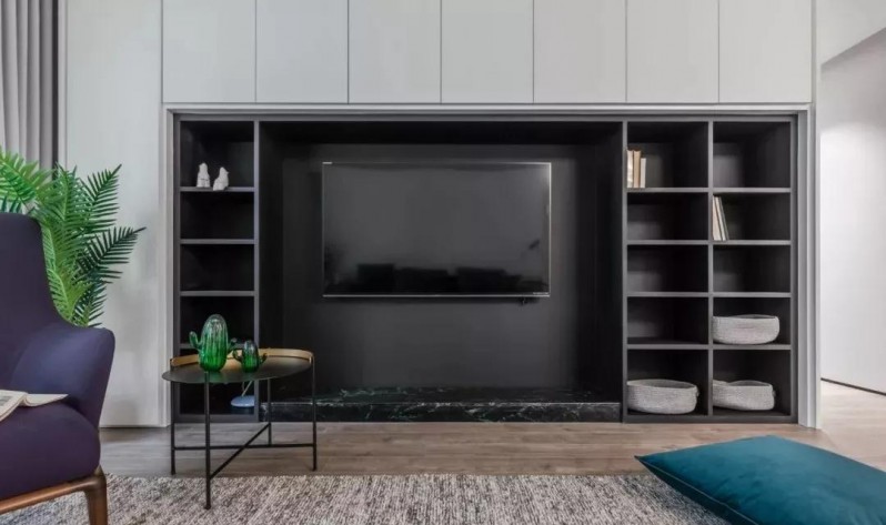 黑色铁艺边几,搭配相同颜色、材质的台灯, 实用也不失设计感。电视背景墙,充足的储物空间。哑光的黑、纯粹的白、柔和的灰,时空中流动着舒缓的旋律。