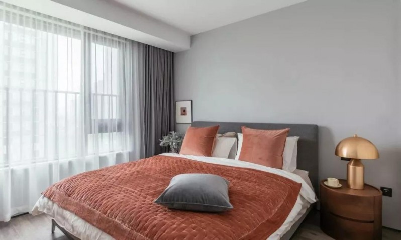 主卧以优雅的灰色为背景色,粉橘色法兰绒床上用品以及金色的台灯这些轻奢元素的加入,优雅之上加了几分精致的轻奢感。