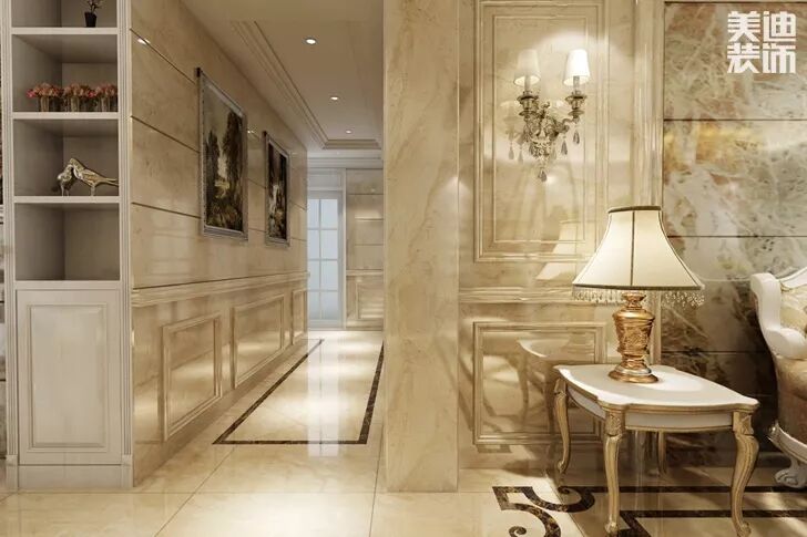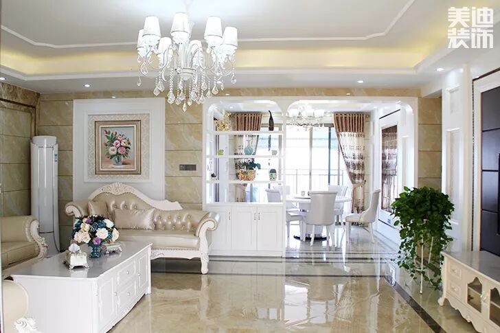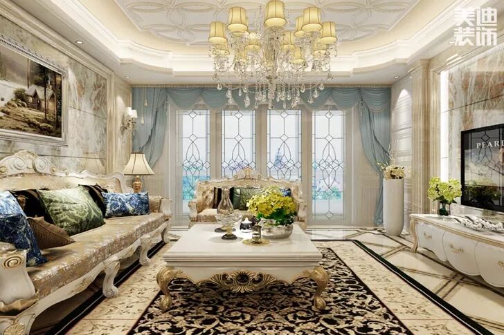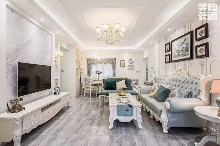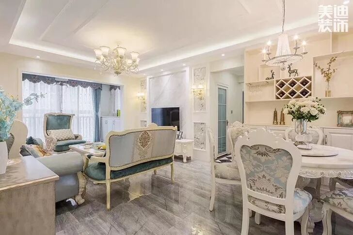 在这套案例中,伍锡雷设计师采用了浅色为主,深色为辅设计,整体的白色加上40%的浅蓝,在简约优雅的欧式风格中融合的恰到好处。客厅通过浅蓝色窗帘、欧式壁画、复古座式电话机来点缀,更显得欧式风格的浪漫风情,毫不掩饰其大方优雅的特色。地砖大理石印刻花纹,富贵优雅。