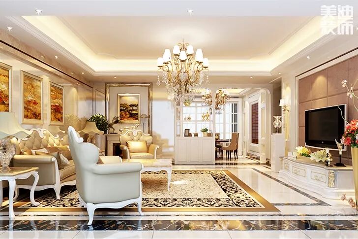 李欣玫设计师打破传统欧式色调的原则,大量运用白色、米色等浅色调设计。灰色电视背景墙和地板花纹搭配,营造简洁大方的整体氛围。同时瓷砖上墙设计、欧式风情的壁画、大气流畅的吊顶,使得整个空间的映衬对比都显得相得益彰。