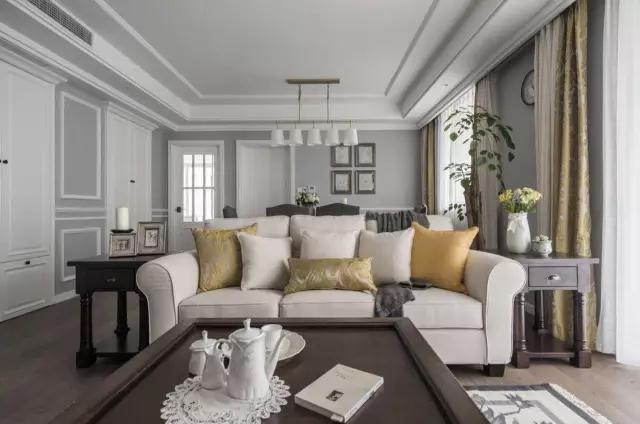 客厅整体以暖色调的氛围多加以木色的修饰,在加上黄色抱枕的点缀,给人以温馨家的感觉。尤其在阳光的沐浴下更增添另一种韵味,客厅还是以白色为基调,墙面是浅灰色乳胶漆,挂画和壁灯装饰,清新中带一丝复古感,米色布艺沙发优雅舒适,深色茶几恰到好处,窗帘也是用了比较复古的风格。