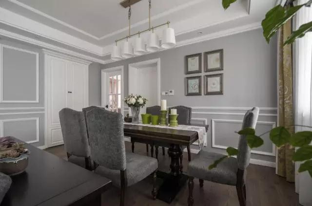 深色餐桌与灰色餐椅组合,配上绿色的烛台和鲜花,整个餐厅看起来和谐也不失活泼、有情调。
