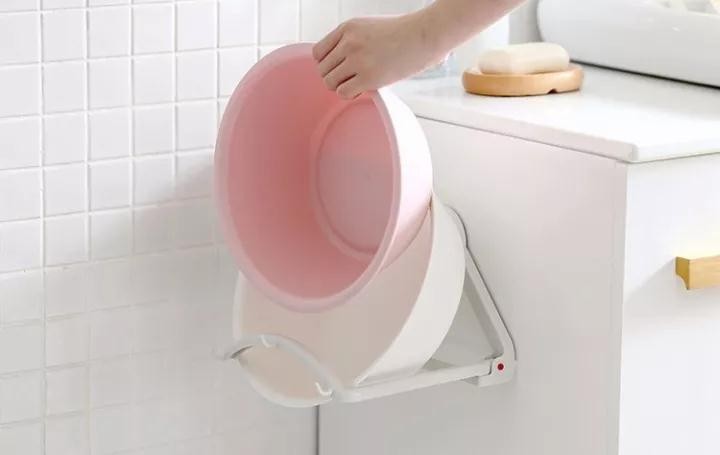 如果地上空间不多的话,还可以利用墙面空间,马爸爸网站上有很多款式的脸盆挂钩,往墙上粘或者吸盘。而且很多挂钩也可以同时收纳N个脸盆,也是可以盆套盆。墙上或者浴室柜的侧面等,哪里有空,或者哪里不碍事就挂哪里。