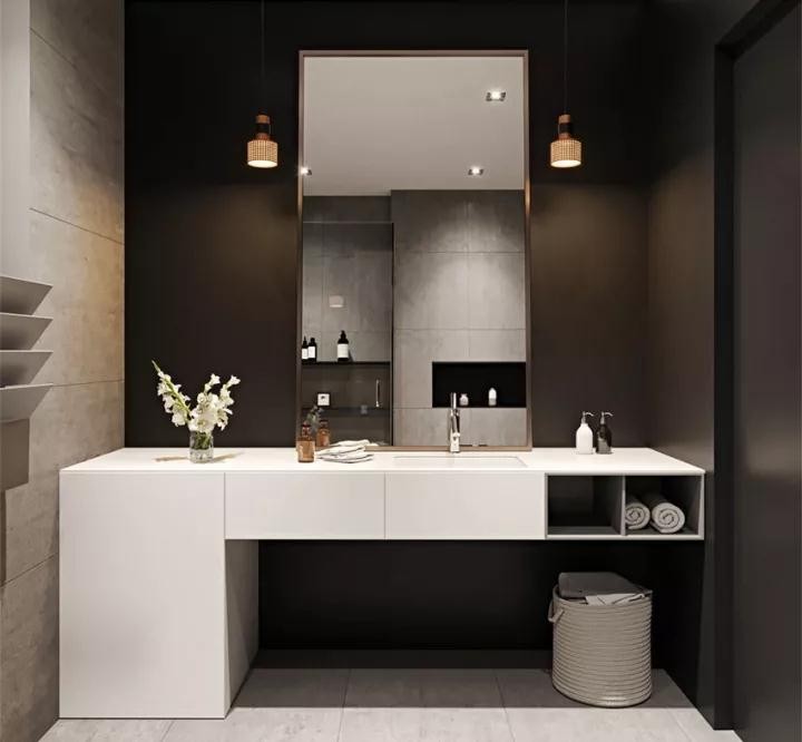 第一,做个大型的浴室柜子,把脸盆放柜子里面,浴室的东西都有地方放不说,小物件都能"藏"起来,就显得干净清爽多了~