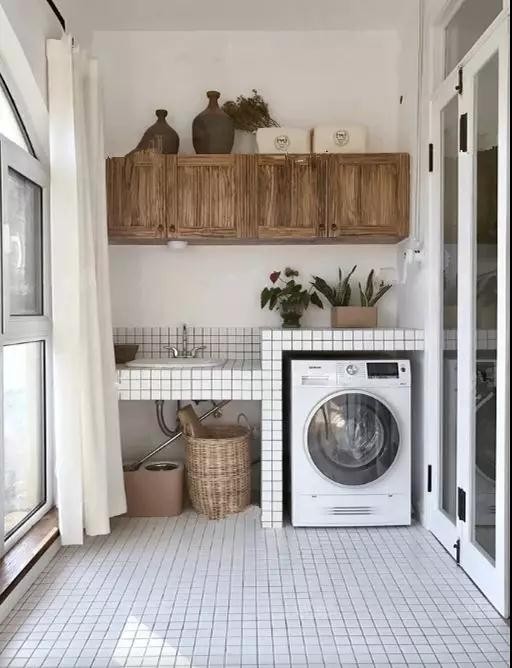 有时卫生间面积不大,放了洗衣机就没什么空间了,那就把它塞进厨房吧。厨房有上下水,水路的改造方面不会太麻烦而且国外非常流行这样的方法。