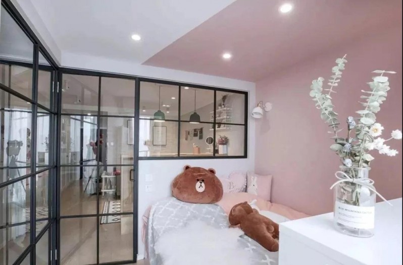 卧室部分墙面涂刷粉色乳胶漆,少女心爆棚,搭配黑色铁件隔断与门片,高级感十足。