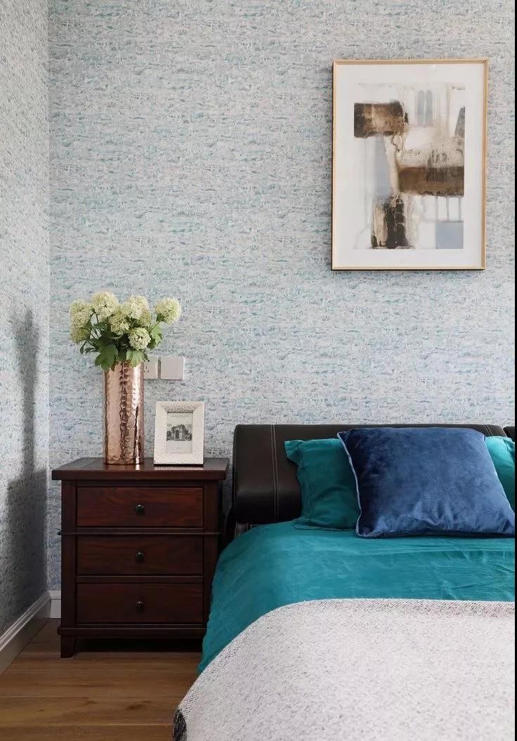 卧室的设计简约的墙纸+床头挂画装饰,深蓝色软装装饰,静谧适合卧室环境。