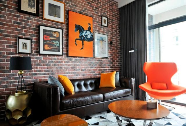 吊顶的黑色吊轨射灯搭配巧克力色皮质沙发,简约中又带了一丝粗犷,同时橙色的抱枕和橙色的单人椅相呼应,让整体空间不会太压抑。