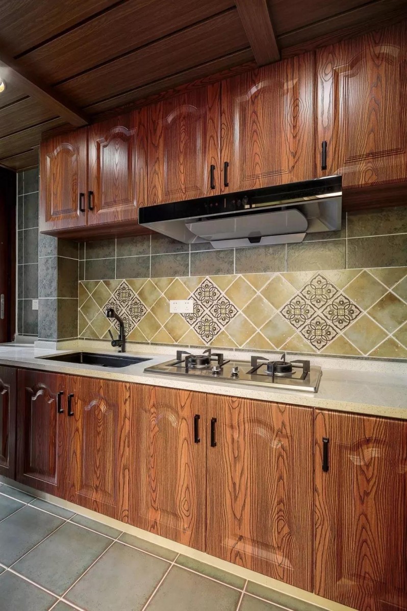 木纹橱柜搭配复古地砖、花墙砖,顶面设计采用木色拉槽处理。