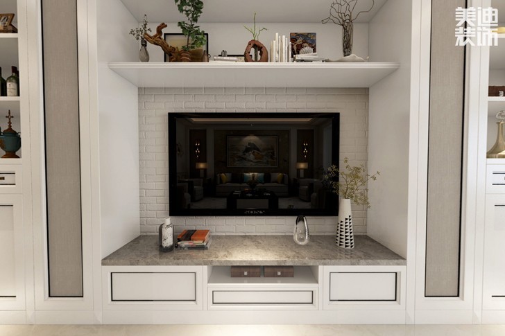在面积很小的家庭中,可以将书架与电视墙结合在一起。将电视墙和书架融合一体,再在书架上放上各式各样的书本,增加了家里的文艺气息。这种设计也可以大大增加实用性,还不会占据过多的空间,属于兼顾了实用性与美观性的电视墙设计。