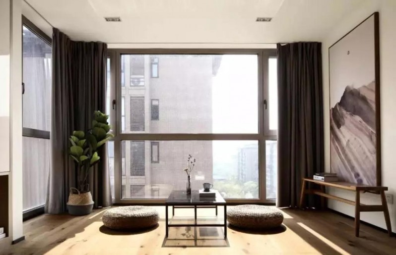 客厅的阳台打通了,并把阳台纳入客厅,阳台上做了榻榻米,靠近窗子摆放上一张小桌子,两个小蒲团,还有大盆绿植,真的很悠闲惬意。
