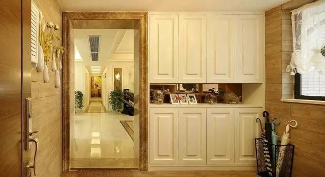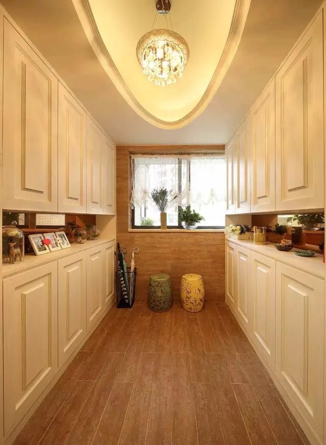 两排大大的储物柜极大地满足了一家人对储物的需求,中间镂空的部分被女主人拿来摆放一些照片和随手买的小物件。欧式的门板与上面的欧式天花造型相呼应,简约大气的感觉。