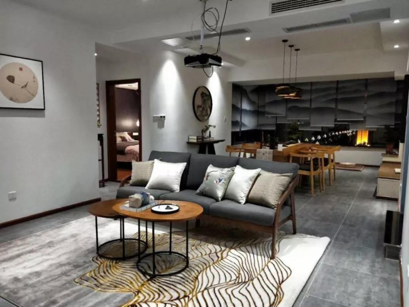 客厅设计极为简约,小茶几+多人沙发,软装搭配亮点在于客厅的地毯,短绒毛地毯质感舒适,金线修边纹路装饰,给人一种轻奢美。