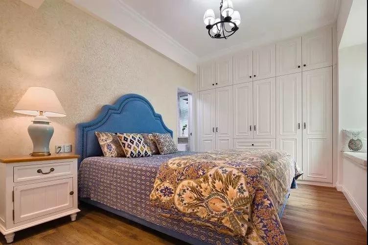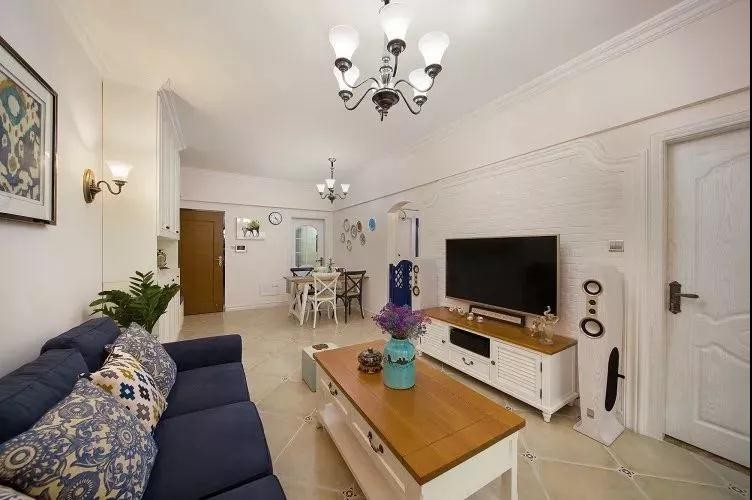 蓝色的沙发和一些蓝色的配饰,搭配沙滩色仿古地砖很有海的气息。小户型装修设计,开放式客餐厅,除了采光好,能进行空间利用最大化。