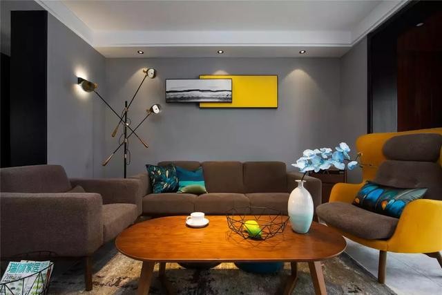客厅,地免铺贴的灰色瓷砖,墙面也是刷的灰色涂胶器,中规中矩,但深咖色沙发的搭配却呈现出别样风情,墙面壁画的组合方式也极富创意,黄色调的加入让空间更显活力。