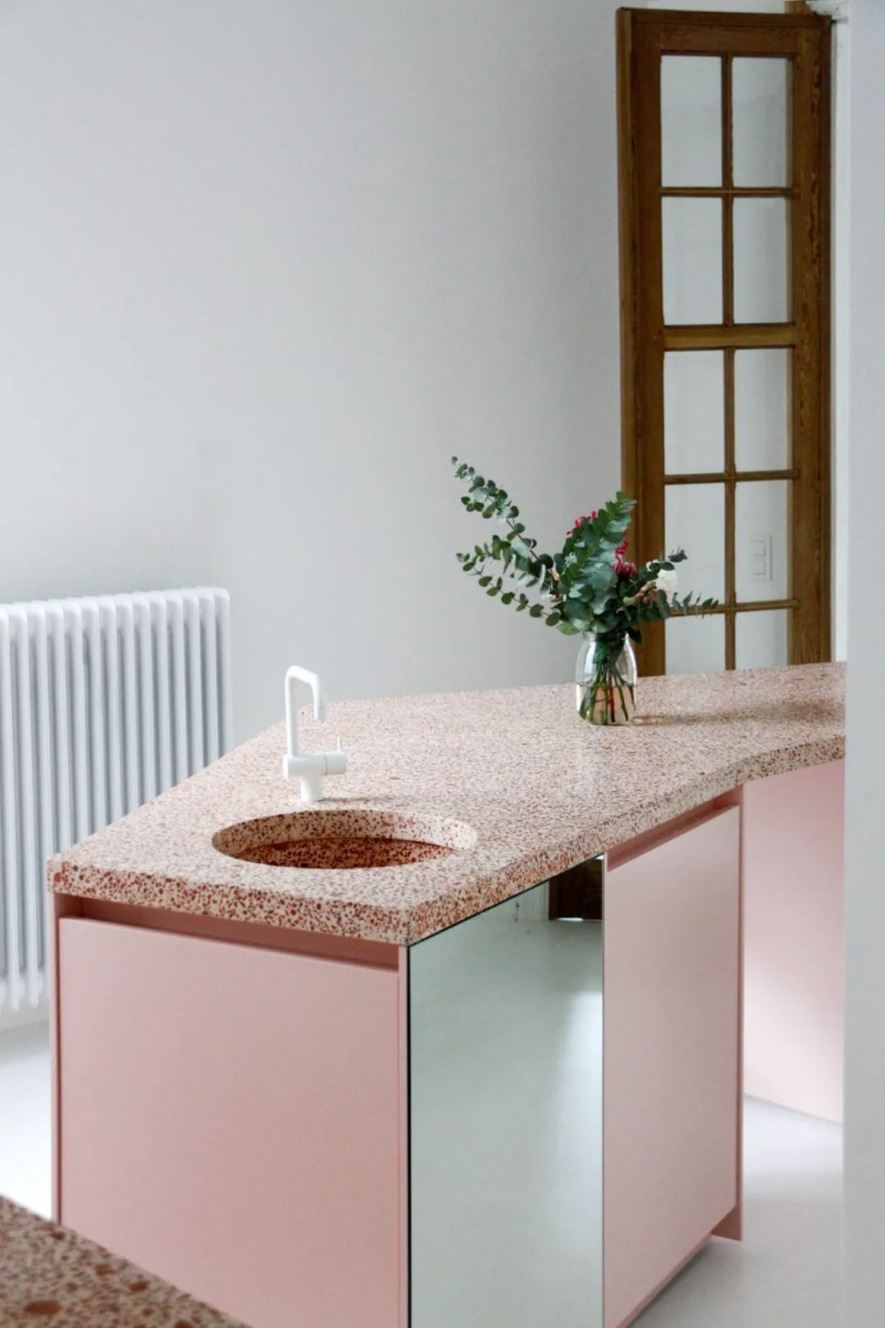 作为一种人造石,水磨石就是将不同色彩和不同大小的碎石、玻璃、大理石、石英石、花岗石等拌入水泥粘接料制成混凝制品后,再经表面研磨 、抛光的制品。这个曾被看作低廉、守旧的材料,近两年又以各种形式不断出现,其随意不规律的花纹和样式,赋予创作更多的想象和可能。