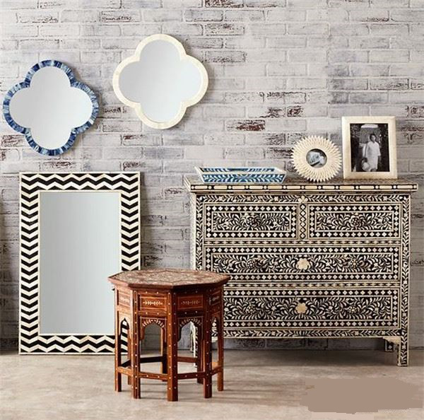 带有骨木镶嵌元素的家具再次流行起来,它们工艺复杂,往往会用到象牙、黄杨木、红木、花梨木、牛骨、螺钿、铜片、腊石等原料,造价自然不菲。