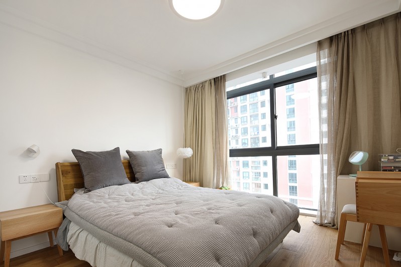 卧室的光线非常好,双层的布艺窗帘契合了整体色调,让卧室看上去更多了安静的感觉。卧室家具的搭配也尽量是用到了原木色,温馨且清新。