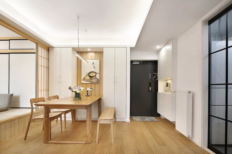 温润的木色与简单的白色相搭配,营造出舒适的居家环境。玄关处装修非常简洁,没有做任何设计,空间上一览无余。