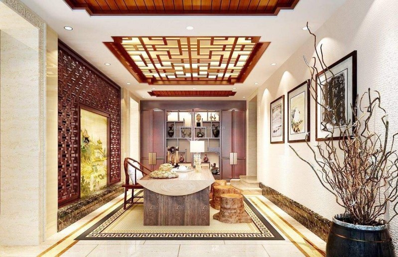 在中式风格和新中中式风格吊顶也是有很大的不同的,像传统的中式风格在建筑形态上属于木结构房屋,因此屋顶必然是橼木、横梁,虽排列整齐,根根分明,但吊顶材料安装的高度一般较低,会产生一定的空间压迫感。而新中式风格运用现代设计元素打造色调明快、简洁有力的现代吊顶,配以中式字画、多宝格等传统元素点缀墙壁,或选用中式风格的吊灯、吸顶灯等灯饰,凸显中式风味,呈现出的空间更加宽阔,采光的效果也更佳。