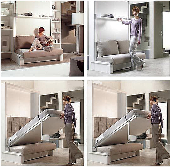 这款节省空间的创意家居,功能多多,我们可以从图上看到这款家居的主体是一个壁床,白天的时候就把壁床收起来靠在墙上,床下是一个架子,推起来就正好是一个壁橱,然后底部是一个双人到三人的沙发;到了晚上,就把壁床放下来就可以睡觉了。这是一个非常节省空间的创意家居,不仅有壁橱,有沙发还有床,但是它的总体占地空间也就在4-6平方米左右,非常实用!