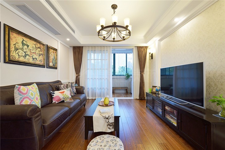 电视柜与茶几之间的过道提供了能充分活动的空间,屋主母亲同时也是一位喜爱动物的女性,这在壁画及摆饰中就能看出。白色的壁柜既符合整体的风格,同时也最大程度的利用了房屋的空间。