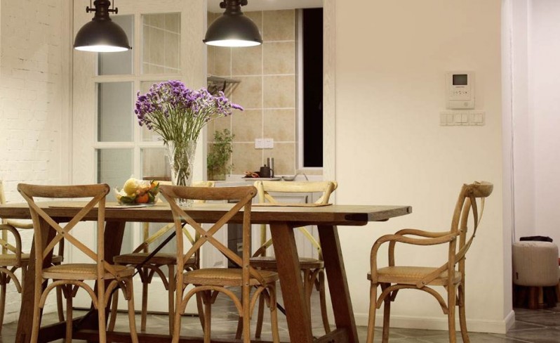吊灯和桌椅门框一样,保持黑色线条元素,不仅是黑色灯罩聚光效果好,它搭配黑墙和美式工业风的餐桌椅也是不同凡响。